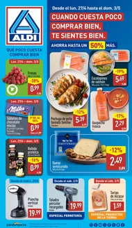 Aldi es una marca alemana de supermercados con muchos años de experiencia que ha llegado a ser conocida por su oferta de productos variados a precios asequibles y por sus ofertas semanales. Aldi ofrece productos de alimentación frescos, congelados y preparados, además de artículos de limpieza y cuidado personal con un sello de calidad. ¿Has comprado en los supermercados Aldi? Te contamos más sobre sus productos más populares y las ofertas que puedes encontrar en sus establecimientos. Para empezar a beneficiarte de sus ofertas actuales y estar al día de las últimas promociones y novedades, consulta el folleto online de Tiendeo.